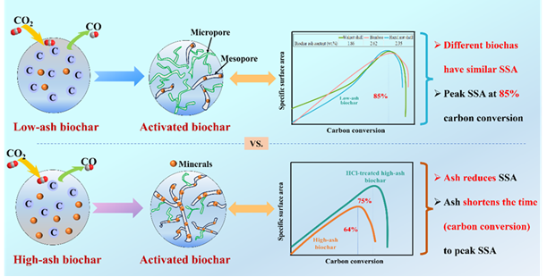 依托我校资源化工与材料教育部重点实验室自主研发的在线颗粒采样微型流化床反应系统,本研究系统考察了生物炭热化学活化过程的动态演变,并聚焦于活化终点的科学判据构建。