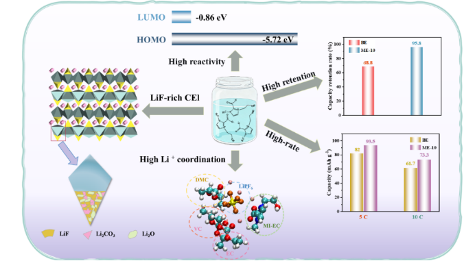 该研究不仅为开发高稳定性、高功率锂离子电池提供了可行的电解液添加剂策略,也为未来高性能储能材料的设计与应用奠定了理论基础。MI-EC的引入,标志着离子液体添加剂在实用化进程中迈出了重要一步,未来有望在动力电池、储能系统等领域实现更广泛的应用。