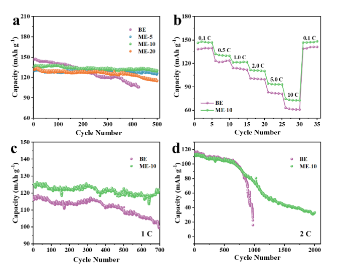 为验证MI-EC的实际性能,研究团队开展了系统的电化学测试和微观表征,结果显示,仅添加1 wt%的MI-EC(ME-10),就能让锂离子电池的性能实现质的飞跃。在LFP‖Li半电池中,0.5 C电流密度下循环500次后容量保持率达95.8%,较标准电解液(BE)提升27%;10 C高倍率下的容量较BE提高18.8%,充放电电压间隙仅100 mV,极化程度大幅降低。Li‖Li对称电池测试中,ME-10电解液的循环寿命从BE的150 h延长至270 h,提升80%。在石墨‖Li半电池和LFP‖石墨全电池体系中,MI-EC添加剂同样表现出优异的兼容性,大幅提升了电池的循环稳定性和倍率性能。微观表征结果进一步揭示了MI-EC的作用机制。SEM、TEM、AFM等表征显示,使用MI-EC后,电极表面更加平滑、SEI/CEI更均匀致密。XPS分析证实,MI-EC参与构建的界面层中,含氮组分和无机LiF含量增加,进一步增强了界面稳定性和离子传导性。